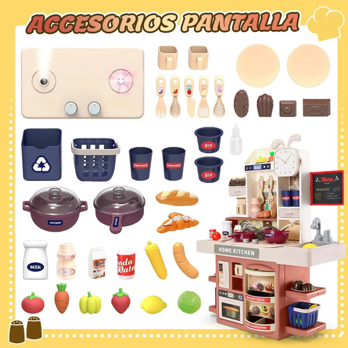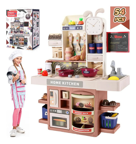 Juego de Cocina de 54 PiezasEste es un juego de cocina muy completo, con agua corriente, estufa, cocina, refrigerador, horno, cafetera, dispensador de agua y otros accesorios de cocina también incluye verduras, frutas, pan, bocadillos y varios condimentos puede lograr todas las funciones de la cocina como cocinar, lavar verduras, cortar verduras, lavar platos, freír, etc.
