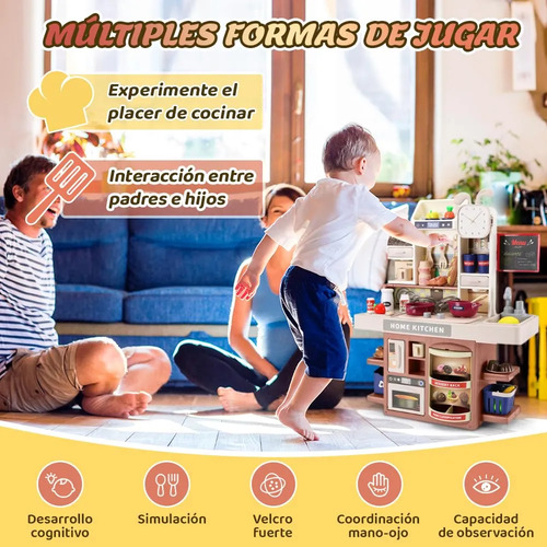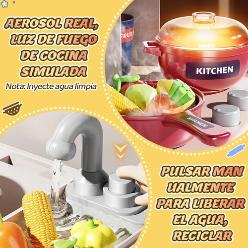Experiencia de Cocina RealistaCuando se enciende la estufa, producirá sonidos de cocina realistas, y luego producirá vapor y humo, y tendrá efectos de iluminación realistas el juguete del fregadero está equipado con un sistema de circulación de agua, y los niños pueden lavar alimentos y vajilla. Brinde a los niños una experiencia de cocina inmersiva y simule habilidades culinarias reales.