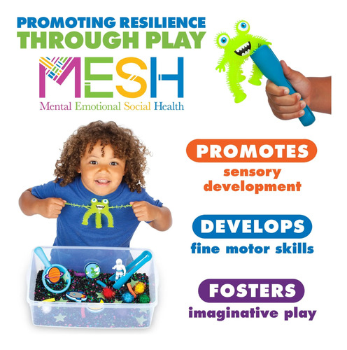 Contenedor sensorial: los contenedores sensoriales permiten a los niños descubrir, imaginar y aprender mientras involucran sus sentidos. Coloca el juguete sensorial autónomo en un mantel o toalla y recoge, ordena, cava y construye para una fácil limpieza y un sinfín de horas de juego práctico