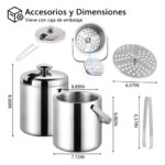 Conservación en frío duradera Esta cubeta de hielo aislada al aspiradora de doble adopta un diseño engrosado de doble capa de 130 mm y se puede mantener fría durante 2 horas a una temperatura normal de 22 grados, para que su tiempo feliz no se vea interrumpido. Equipado con una barrera contra el hielo, puede evitar eficazmente que el hielo entre en contacto con el agua, aumentando así el tiempo de mantenimiento del frío. La capa de vacío en el medio evita que aparezcan gotas de agua en la superficie de esta cubeta de hielo de acero inoxidable, protegiendo tu mesa de la humedad.