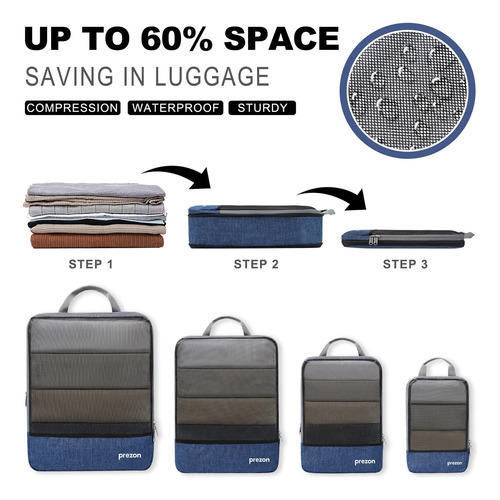 Comprimir para impresionar: equipados con cierre de compresión, nuestros cubos de viaje te permiten comprimir el volumen de tu ropa hasta un 60% y te ayudan a almacenar y transportar más en la misma bolsa.