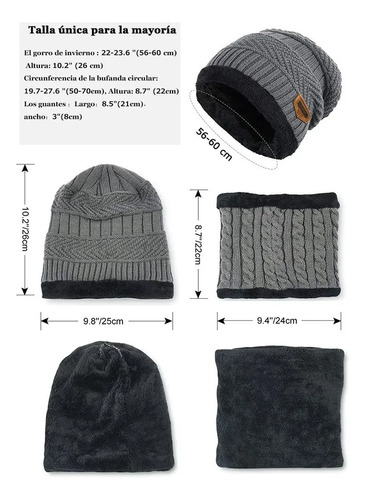 Información del TamañoCircunferencia del sombrero: 22-23.6 (56-60 cm), Altura: 10.2 (26 cm) Circunferencia de la bufanda circular: 19.7-27.6 (50-70cm), Altura: 8.7 (22cm),Los guantes Largo8.5(21cm)ancho3(8cm) .Gorras beanie con bufanda con guantes para hombre y mujer tiene un grado de flexibilidad. Agradable para la mayoría de los adolescentes y adultos.