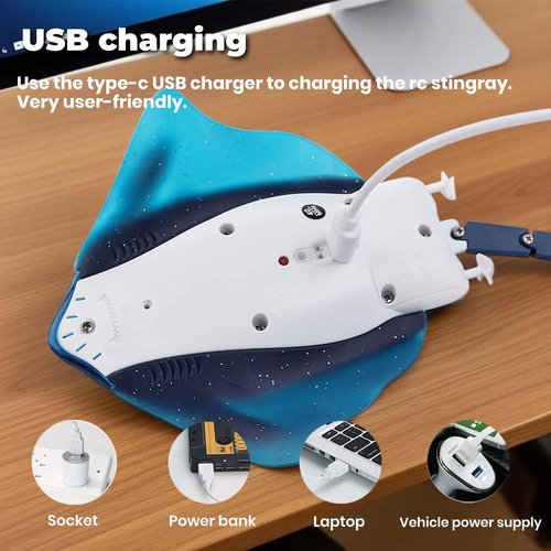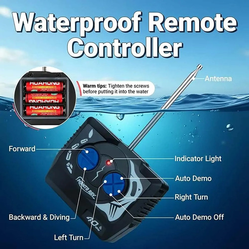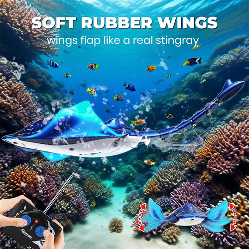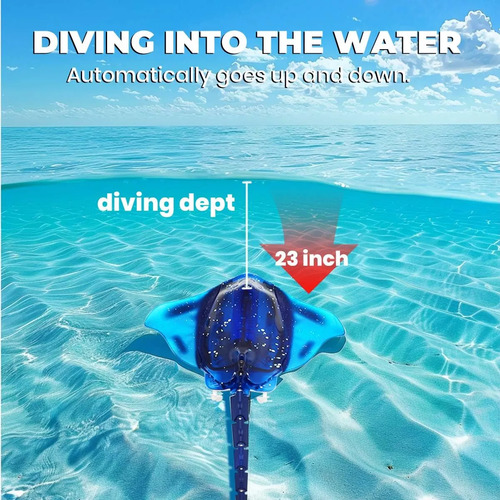 Control remoto impermeable: un anillo de goma integrado para evitar que el agua entre en el control remoto, pero no empapes el control remoto completamente en el agua. El agua salpica está bien. Pulsa el botón hacia adelante, la raya irá hacia adelante y buceará. La velocidad máxima es de aproximadamente 5 km/h.