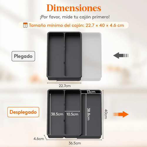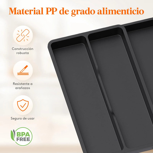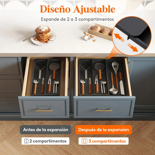 Diseño expandible: Este organizador de utensilios para cajones se puede expandir de dos a tres compartimentos, brindando espacio de almacenamiento adicional para tus cubiertos y utensilios. Su ancho ajustable, que varía de 22.7 a 36.5 cm, asegura un ajuste perfecto para cajones de diversos tamaños.