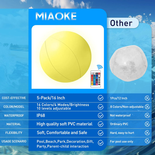 Diseño colorido La pelota de playa MIAOKE de 16 pulgadas está equipada con luces LED controladas por control remoto que pueden cambiar a 16 colores diferentes y cuatro modos de iluminación. La velocidad de iluminación y el brillo son ajustables, y las luces pueden durar hasta 48 horas.