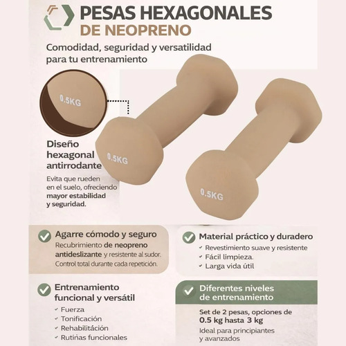 DISEÑO HEXAGONAL ANTIVUELCO: Evita que las pesas rueden al colocarlas en el suelo, proporcionando estabilidad y practicidad.