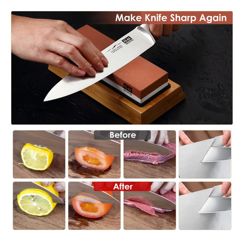 BASE DE SILICONA SIN DESLIZAMIENTO Y GUÍA DE ÁNGULO – El almohadilla de silicona antideslizante puede sujetar la piedra dentro de la base de bambú antideslizante, el excelente rendimiento del antideslizante garantiza la seguridad durante el afilado. La guía de ángulo es propicia para posicionar el ángulo de afilado preciso y proteger sus dedos. El tamaño total de la piedra afilar cuchillos es de 18 6 2,7 cm, perfecta para los cuchillos de cocina más grandes