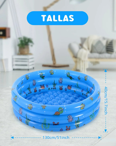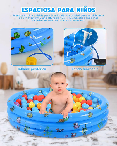 Espaciosa para Niños Nuestra Piscina Inflable para Exterior de alta calidad tiene un diámetro de 51 (130 cm) y una altura de 15,7 (40 cm), ofreciendo más espacio que muchas otras en el mercado. ¡Con capacidad para 3-4 niños, garantiza una experiencia acuática emocionante (Acompañamiento de un tutor requerido, no es dispositivo de salvamento)