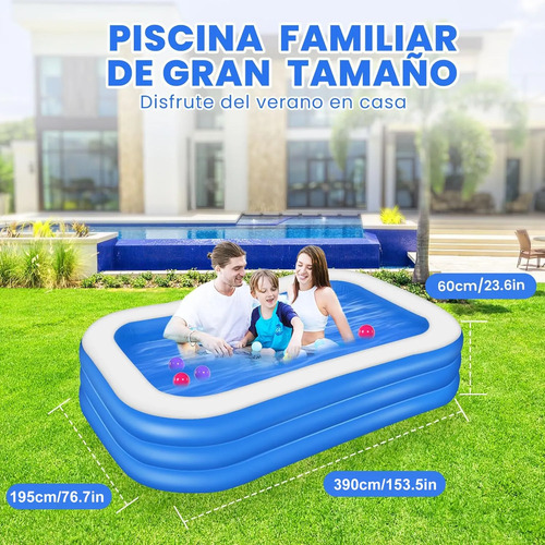 Tamaño Familiar: Piscina inflable rectangular familiar mide 390x195x60 CM y está diseñada para acomodar al menos a 5 adultos y 4 niños, para que toda su familia pueda disfrutar de la diversión y el juego en el agua durante el verano.