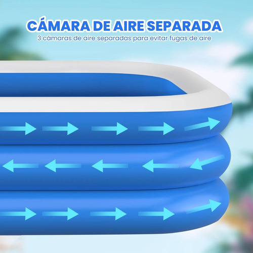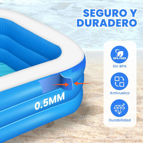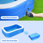 Seguridad y Durabilidad: Alberca inflable familiares está fabricada con material de PVC resistente a los rayos UV y respetuoso con el medio ambiente que garantiza durabilidad y seguridad para la diversión veraniega de su familia.