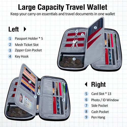 GRAN CAPACIDAD: Porta pasaporte familiar diseñado con 5 bolsillos para pasaporte, 13 ranuras para tarjetas de crédito, 1 ventana de identificación, 1 bolsillo profundo, 1 bolsillo de malla con cremallera, 1 compartimento grande, 1 portalápices, 1 gancho para llaves y correa de muñeca desmontable, 2 bolsillos exteriores y 1 bolsillo trasero con cremallera
