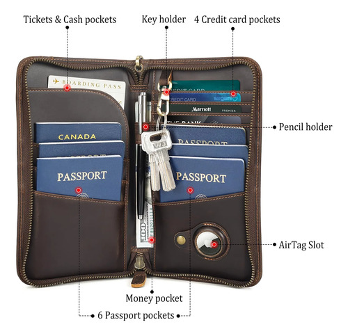 Descripción del bolsillo : 6 bolsillos para pasaporte, 4 bolsillos para tarjetas de crédito, 2 bolsillos frontales para tarjetas de embarque, 1 compartimento para boletos, 1 bolsillo grande para dinero en efectivo, 1 bolsillo trasero con cremallera, 1 soporte para bolígrafos, 1 soporte para llaves