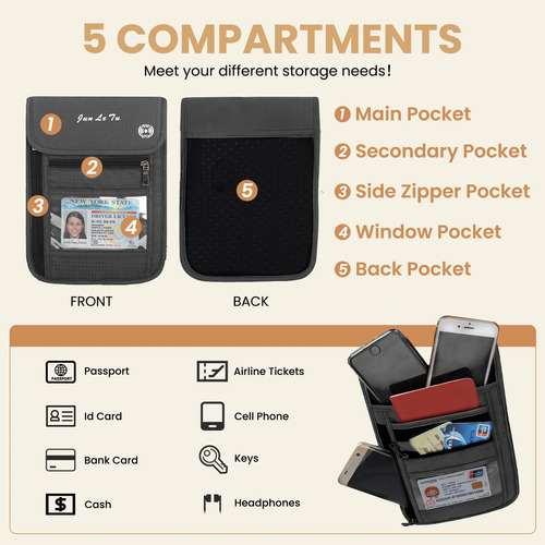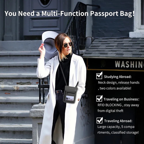 Múltiples bolsillos y correa de hombro ajustable: esta portafolios impermeable para pasaporte de viaje tiene 5 bolsillos. El bolsillo principal puede almacenar documentos valiosos, el bolsillo secundario puede almacenar monedas, etc., el bolsillo lateral con cierre puede almacenar dinero, el bolsillo visual para ventana puede almacenar otros documentos para un fácil acceso, y el bolsillo trasero puede almacenar teléfonos móviles, etc., lo que es cómodo de llevar