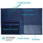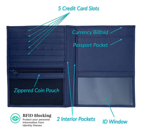 Características: la portafolios para pasaporte contiene un bolsillo para pasaporte cómodo y seguro, billetera profunda para monedas, 5 ranuras para tarjetas de crédito, 1 ventana de identificación transparente, bolsa para monedas con cierre y 2 bolsillos interiores