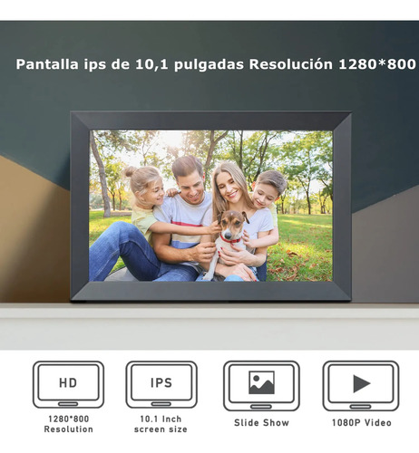 Pantalla HD visual agradable: El marco de fotos digital con pantalla IPS de 10,1 pulgadas transmite una pantalla IPS de 1280 x 800 para reproducir fácilmente fotos, presentaciones de diapositivas y videos. El marco de fotos admite formatos de imagen JPG/JPEG/BMP/PNG y reproducción de video de 15 segundos. Rotación automática, brillo ajustable.