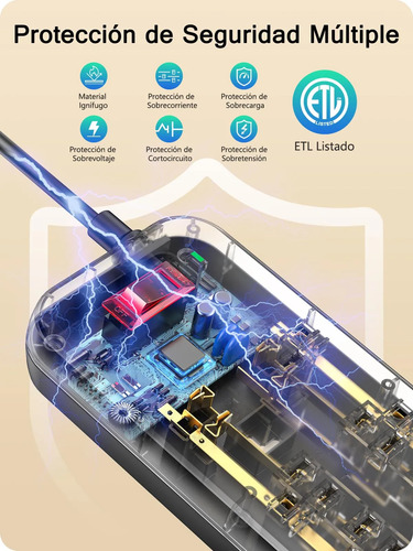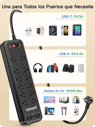Características especiales : 12 Tomas CA, 4 USB-A y 1 USB-C, Interruptor de Encendido y Apagado, Montable, Protección Múltiple, Protección contra Sobretensiones