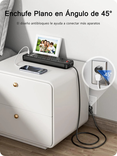 Espacio Amplio y enchufe de ángulo 45o: Cada toma de corriente está separada suficientemente para acomodar incluso adaptadores grandes sin bloqueos, mientras que el ángulo inclinado de 45ogarantiza que siempre quede espacio libre para utilizar enchufes adyacentes al mismo tiempo