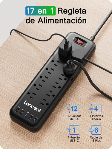 LENCENT Regleta Multicontacto USB con Protector de Sobretensión, Conector Múltiple con 12 Tomas de CA y 5 USB (1 USB-C), Extensión Eléctrica Cable de 1.8 M para Hogar, Oficina, Dormitorio, ETL Listado