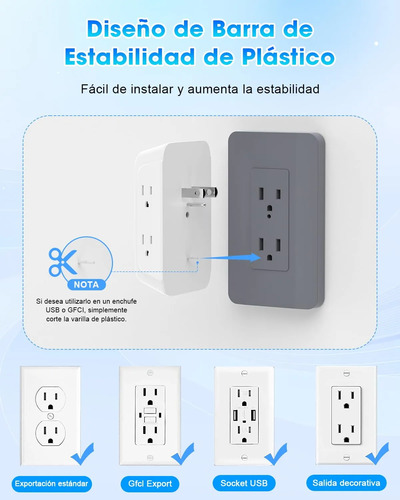 Wide spaced AC outlets9-IN-1Tomacorriente de pared multifuncional,6AC2USBTipo C,se adapta perfectamente al tomacorriente,sin problemas de cables de extensión,espacio suficiente para adaptadores de corriente grandes sin bloquear otros tomacorrientes