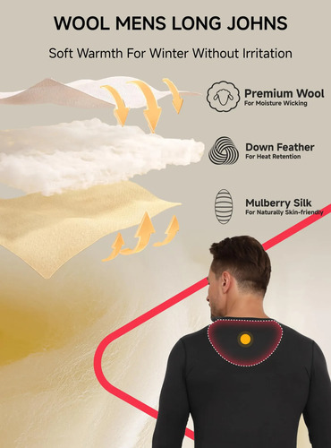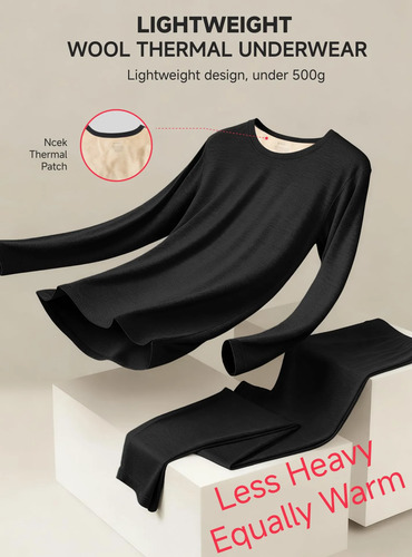 Calidez ligera y suave: diseñada con tela de mezcla de lana de primera calidad, la ropa interior térmica pesa menos de 500 g y ofrece calidez suave sin añadir volumen. Añadimos especialmente parche cálido para el hombro y el cuello a las áreas clave de pérdida de calor, asegurando un calor acogedor en climas fríos