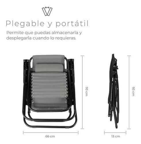 MEDIDAS:La silla camastro mide 175 cm largo x 65 cm ancho x 110 cm alto. Plegada mide 66 cm largo x 15 cm ancho x 93 cm alto