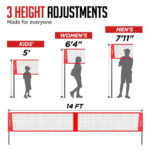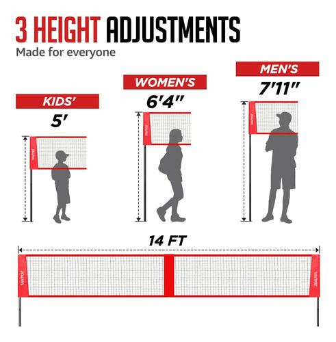 3 alturas ajustables para todos: adapta el juego a tu gusto con 3 alturas de red ajustables, 5 pies para niños, 7 pies 4 pulgadas para mujeres y 7 pies 11 pulgadas para hombres. No importa tu edad o nivel de habilidad, esta red de voleibol de 4 vías se adapta a ti ya sea que estés jugando con niños o adultos, toda la familia puede disfrutar de horas de diversión con alturas de red fácilmente ajustables