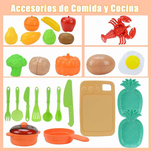 Juegos de Comida de Juego para Cocina de Niños: Nuestro juego de cocina de juguete de comida para niños viene con una gran cantidad de alimentos e ingredientes, que incluyen huevo, langosta, frutas, verduras y mucho más, así como cuchillos y utensilios de cocina resistentes para una experiencia completa de juego de simulación.