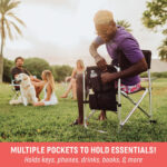 Características: el panel de accesorios en esta silla de picnic ofrece una variedad de bolsillos para guardar artículos personales, una bolsa aislada para bebidas embotelladas, bolsillo de seguridad con cierre y una mesa auxiliar resistente que se pliega