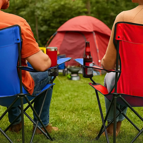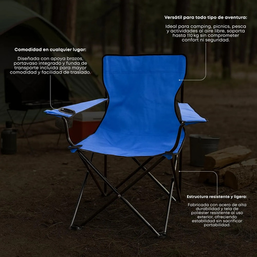 Diseño cómodo y ergonómico: Asiento y respaldo de poliéster resistente con descansabrazos que brindan soporte adicional. Ideal para largas jornadas al aire libre, ya sea en la playa, el bosque o el parque.