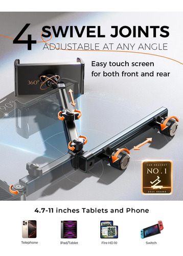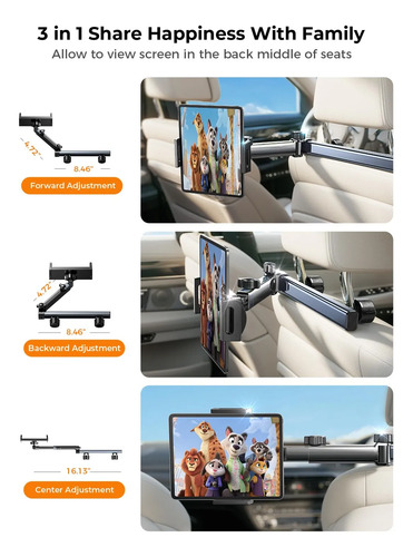 TV de coche para asiento trasero garantiza que la tablet o visualización esté siempre en el ángulo de visión óptimo para tu bebé o bebé. El brazo puede girar e inclinarse en tres ejes (arriba/abajo, izquierda/derecha y adelante/atrás), lo que permite un posicionamiento perfecto de la visualización sin importar la altura del niño o la posición del asiento.