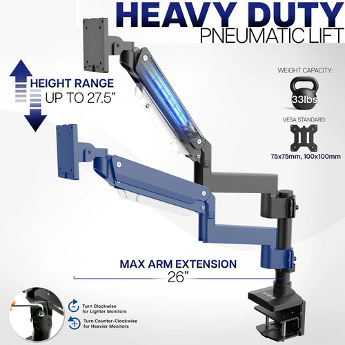 Totalmente Ajustable: El soporte ofrece un amplio rango de movimiento flexible con inclinación de -45o a 45o, giro de 180o, rotación de 180o y ajuste de altura suave de 33cm con elevación por resorte neumático. Se proporciona un ajuste de altura adicional en el poste de extensión de 33cm
