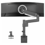 Soporte de Brazo de Aluminio Premium: sostiene de forma segura una pantalla con un peso de hasta 15kg. Cuenta con un medidor de resorte de codo para un ajuste perfecto del peso, una gestión de cables clara y una placa VESA de liberación rápida para una fácil instalación del monitor