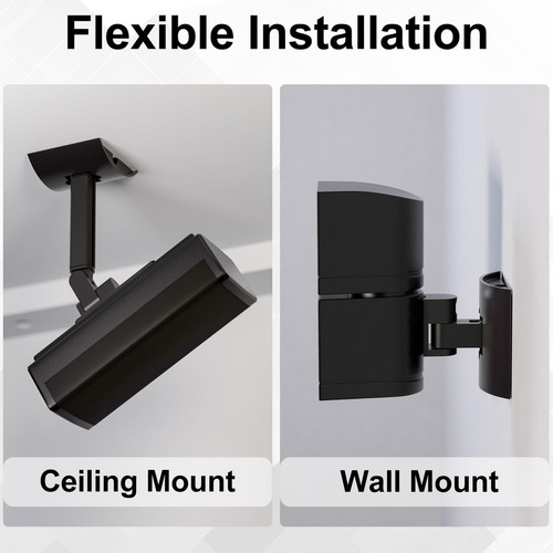 – Diseño 2 en 1: este soporte de pared para altavoz se puede instalar en pared o techo, ofreciendo flexibilidad para configurar el sistema de audio en varios escenarios.