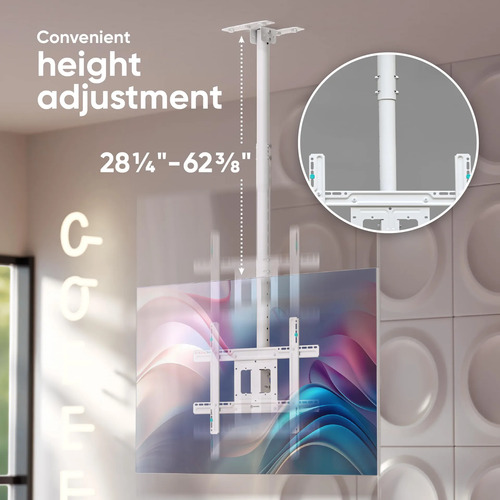 Para el hogar y la empresa: el soporte de techo para televisión es perfecto para uso doméstico o profesional. El soporte de TV de techo orientable facilita la instalación en sala de estar, terraza o espacio comercial. Este soporte para TV para techo se adapta a cafeterías, restaurantes y tiendas. La fijación de techo tele garantiza seguridad y comodidad de uso.