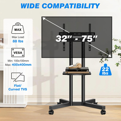 Ampliamente compatible: adecuado para la mayoría de televisores de 32 a 75 pulgadas: nuestro soporte de TV portátil sobre ruedas es compatible con la mayoría de televisores planos/curvados que van desde 32 a 75 pulgadas de varias marcas. La capacidad total de carga asciende a 80 libras, y la capacidad de carga del estante es de 22 libras. Es adecuado para tamaños VESA que van desde 100 x 100 mm hasta 400 x 400 mm. Nuestro soporte de TV de piso de aspecto negro mate presenta una postura discreta y elegante y se puede adaptar a cualquier estilo de decoración. Ya sea un estilo minimalista lleno de modernidad, un estilo tradicional que irradia encanto clásico o un estilo moderno, se puede integrar perfectamente y añadir un encanto distintivo a tu entorno de hogar