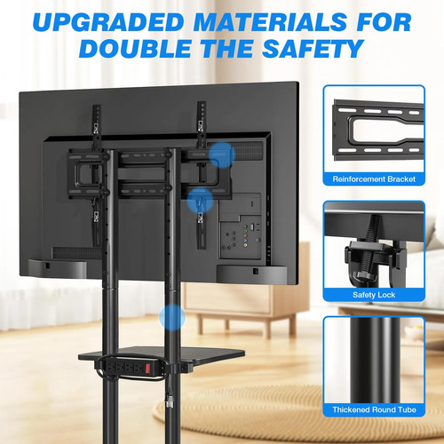 Estructura resistente: protege la seguridad de los miembros de la familia: empleamos acero grueso de alta calidad para fabricar el tubo redondo de soporte, haciendo que el soporte sea más grueso y el centro de gravedad sea más estable, reduciendo eficazmente el problema de inclinación. Soldar el tubo redondo grueso en una estructura en forma de X mejora significativamente la estabilidad del soporte y no se agita incluso cuando se mueve. Además, el diseño de la cerradura de seguridad proporciona una sólida garantía de seguridad y evita que el televisor caiga bajo cualquier circunstancia. Incluso las familias con niños pueden utilizar nuestro soporte de TV portátil con tranquilidad y garantizar la seguridad de los miembros de la familia