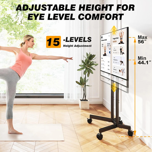 Altura ajustable de 15 niveles para un nivel óptimo de ojos: el carrito de TV con ruedas ofrece 15 ajustes de altura de 44.1 a 56 pulgadas de ajuste. Esto significa que puedes personalizar fácilmente el soporte para adaptarse a tu nivel de ojos preferido, sin importar dónde estés sentado o acostado, para que puedas relajarte y disfrutar de tu mirada con total comodidad.