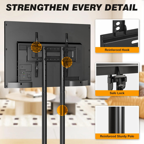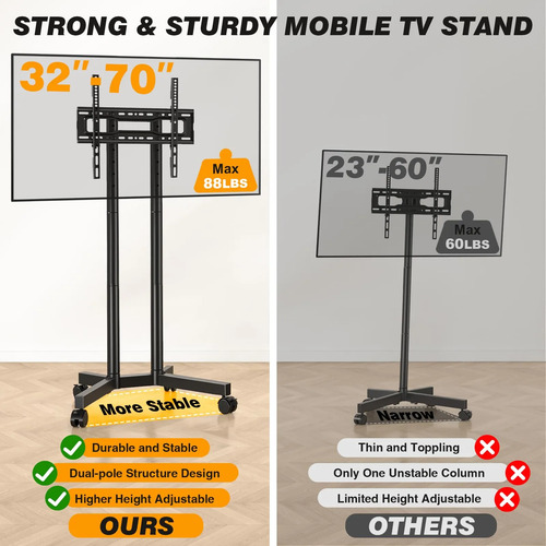 Estabilidad estable de actualización de poste durable: el carrito de TV móvil 5Rcom está diseñado con una estructura estable de doble polo que está hecho de material reforzado, mejora la estabilidad adicional. Soporta hasta 80 libras, proporcionando una base sólida para tu televisor. Además, su bloqueo de seguridad garantiza que todo se mantenga seguro, protegido de un televisor que se cae, doble seguridad para ti y tu familia. Disfruta de una experiencia estable con nuestro soporte de TV rodante sobre ruedas.
