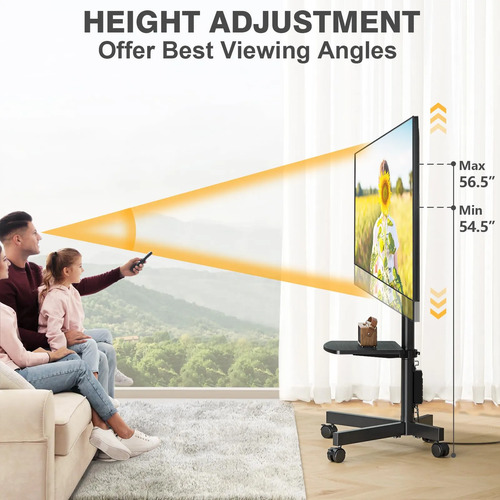 TVON – Soporte de TV móvil con toma de corriente, carrito de TV con balanceo inclinable para televisores LCD LED OLED de visualización plana curvada de hasta 85 libras, ajuste de altura portátil con