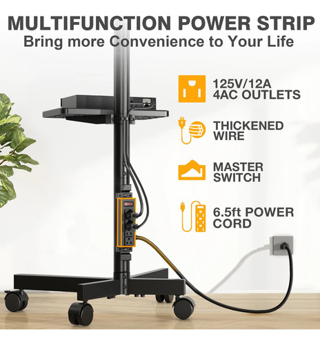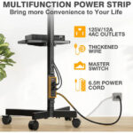 Soporte de TV móvil sobre ruedas: nuestro soporte de TV rodante viene con tomas de corriente. La regleta tiene 4 salidas de CA que pueden alimentar 4 dispositivos simultáneamente. El cable de alimentación grueso y alargado de 6.5 pulgadas está hecho de cobre puro de 16 AWG, más seguro que los demás y tiene una mejor capacidad de carga de corriente (12 A). También tiene un interruptor maestro que se puede apagar, evitando el toque falso y asegurando la seguridad de tu familia, niños y mascotas.