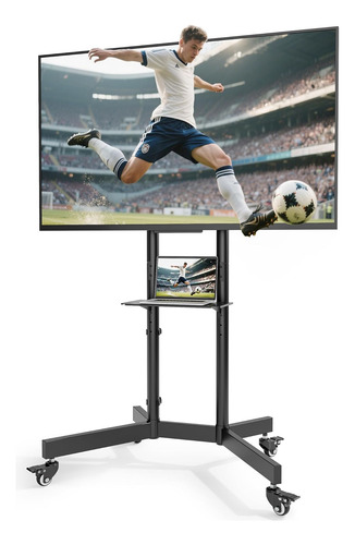 Soporte de TV rodante resistente y duraderoEl metal de alta calidad forma el núcleo de este soporte de TV móvil, garantizando durabilidad y una larga vida útil. La base en forma de X mejora su estabilidad, evitando cualquier movimiento no deseado o inclinación durante el uso. Puede manejar cargas pesadas sin esfuerzo, el soporte soporta hasta 175 libras, adecuado para televisores grandes, y la bandeja tiene capacidad para 22 libras, perfecto para sostener dispositivos de transmisión, controles remotos o barras de sonido.