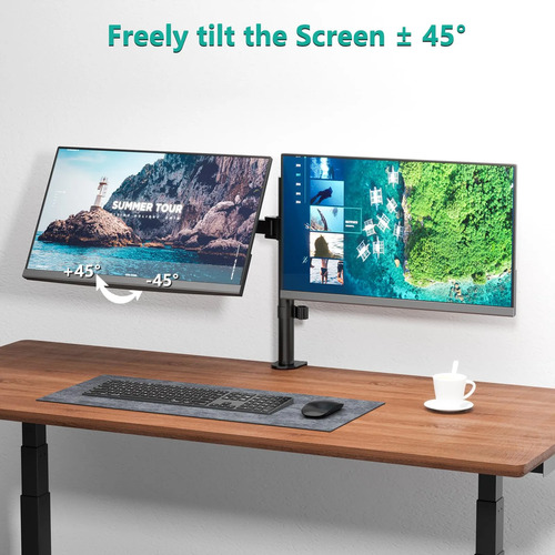 Doble Beneficio: El brazo de monitor dual es fÔcilmente ajustable. Doble eficiencia y productividad al abrir espacio en el computadora, lo que te permite trabajar en una posición mÔs cómoda y ergonómicamente correcta para reducir la tensión del cuello y los ojos