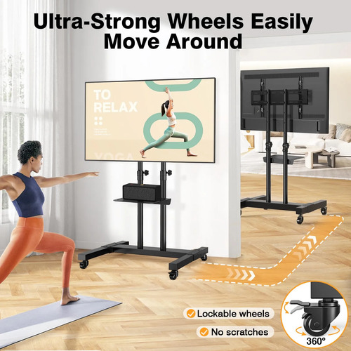 Ruedas de bloqueo: ruedas altas para TV incluyendo 4 ruedas giratorias de 360o de alta resistencia. 2 ruedas giratorias con freno en la parte delantera hacen que el soporte de TV rodante sea estacionario o móvil cuando lo desee, sea fácil de rodar, cambia el ángulo de visión del televisor e incluso para moverlo de habitación a habitación.