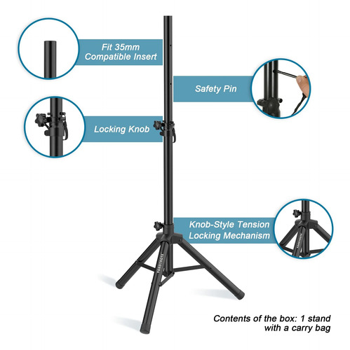 Altura ajustable: el pasador de soporte de seguridad garantiza que tu altavoz sea seguro y estabilidad. Cuatro agujeros de perforación se colocan en el tubo de soporte para cumplir con diferentes requisitos de altura. El rango de altura es de 33.5-53.5 pulgadas, cuatro alturas ajustables son de 33.5 pulgadas, 41.5 pulgadas, 47.5 pulgadas y 53.5 pulgadas.