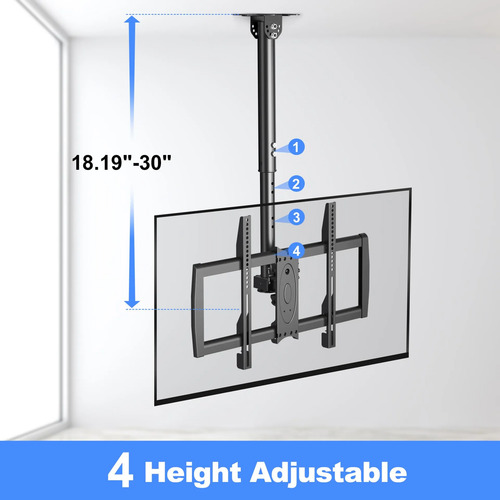 Altura ajustable: hay 4 niveles de altura que puedes ajustar, mínimo 18.19 pulgadas a máximo 30 pulgadas desde el techo hasta el centro de la placa de TV para proporcionar una mejor flexibilidad tanto para habitaciones pequeñas como grandes.
