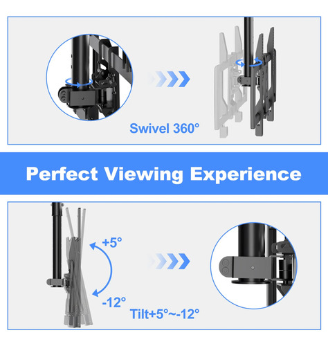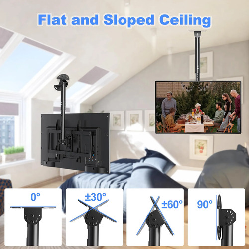 Giratorio e inclinado: el soporte desplegable para TV puede inclinarse 5o/-12o para reducir el deslumbramiento y giro de 360o para ayudarte a encontrar el mejor ángulo de visión. Un soporte de techo es una buena opción para ahorrar espacio.