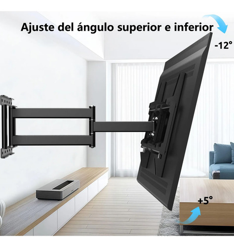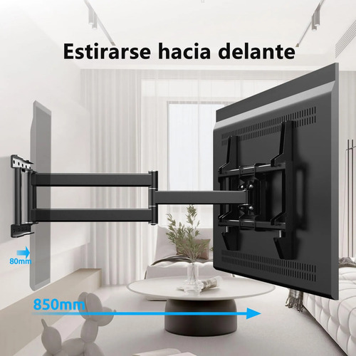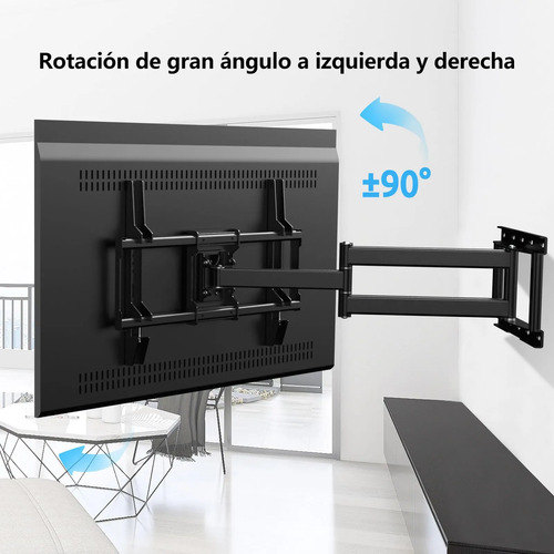 Soporte de pared giratorio para TV:se ajusta hacia arriba y hacia abajo, hacia la izquierda y hacia la derecha, y hacia delante y hacia atrás para colocar el televisor en el ángulo y la posición deseados, girando 90o de izquierda a derecha para conseguir el ángulo de visión más cómodo (el ángulo máximo de giro depende del tamaño del televisor). Reduce el deslumbramiento y ajusta la orientación del televisor según la posición de visualización, lo que permite ver la televisión cómodamente en todas las situaciones