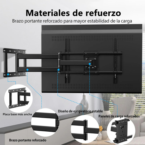 Base de tv con brazo largo:Este soporte de TV de brazo largo con robustos ganchos dobles y diseño de refuerzo de dos lados mejora enormemente la estabilidad del soporte de carga. Tipos de pared de montaje: paredes de madera, paredes de hormigón, paredes de ladrillo. Nota: ¡No instalar sólo sobre paneles de yeso (No utilice anclajes cuando lo monte en paredes con montantes de madera)