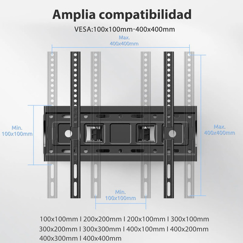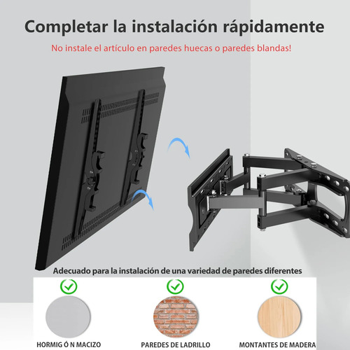 Fácil de instalarNuestro soporte de pared para TV viene con un manual de instrucciones detallado, hardware de montaje estándar , lo que hace que este colgador de TV sea muy fácil de instalar, incluso para los no profesionales. Nota: No la instale solo sobre paneles de yeso.