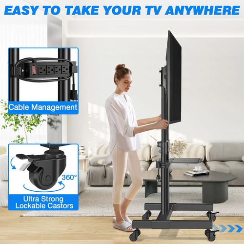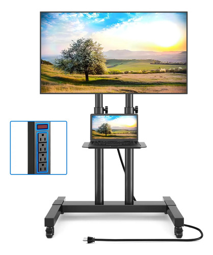 Rfiver – Soporte de TV rodante actualizado con toma de corriente para televisores de 32 a 83 pulgadas, carrito de TV móvil resistente en rueda de hasta 100 libras, soporte de TV portátil ajustable en